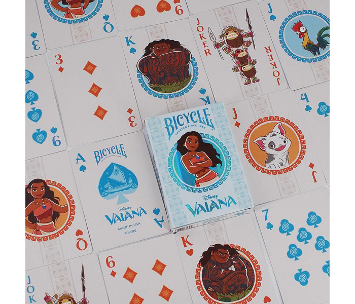 Гральні карти Bicycle Vaiana (Moana) — офіційна ліцензійна колода, створена за мотивами популярного анімаційного фільму Disney. Яскравий, барвистий дизайн із персонажами мультфільму передає атмосферу пригод, свободи та позитивних емоцій, що робить цю колоду особливо привабливою для сімейного дозвілля.